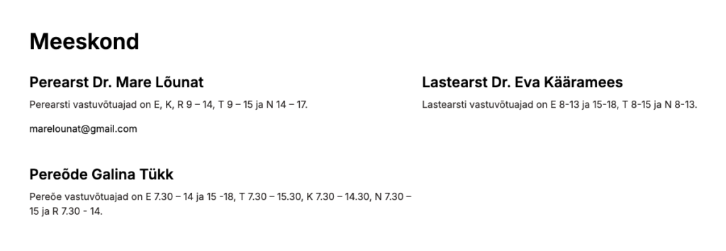 - Tervishoiutöötajad: nimi ja amet, soovituslikult ka spetsialiseerumine.